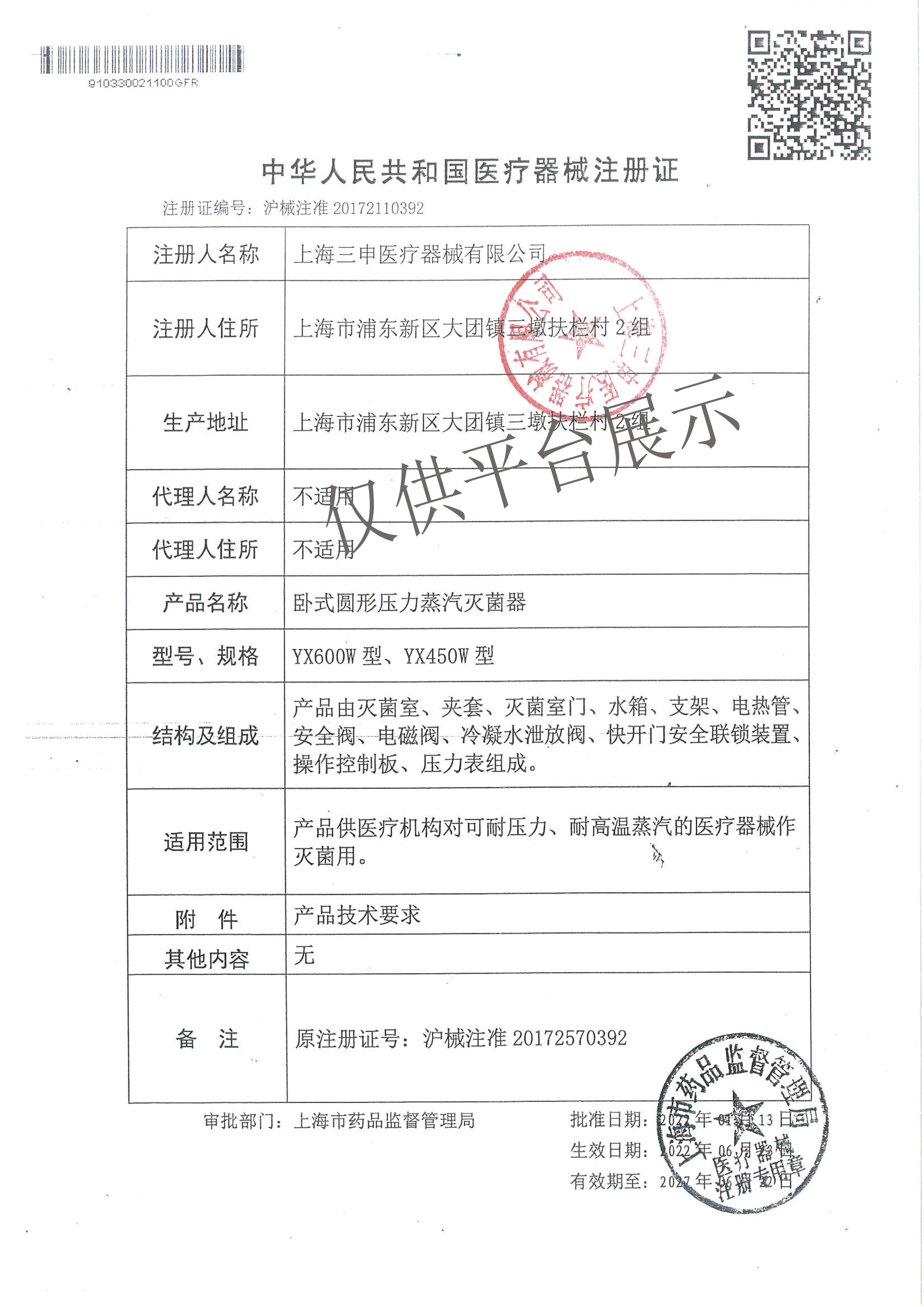 | 產(chǎn)品名稱 : | 三申臥式圓形壓力蒸汽滅菌器YX450W |